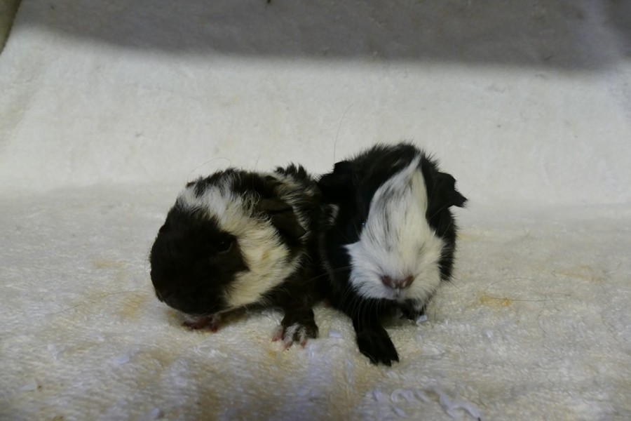 10.3. 2026 Jarní vrhy pokračují. Klučičí dvojčata v černo bílém provedení mají za rodiče Weggie a Jud. Jeden kluk je alpaka. Vrh Ch27.
